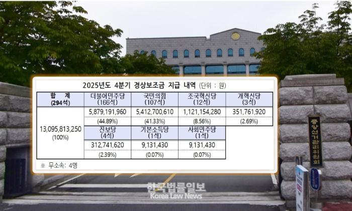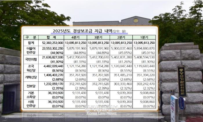 [한국법률일보] 중앙선거관리위원회는 11월 14일 2025년 4분기 경상보조금 130억 9천여만 원을 더불어민주당 58.8억, 국민의힘 54.1억, 조국혁신당 11.2억, 개혁신당 3.5억, 진보당 3.1억, 기본소득당과 사회민주당 각 913만여 원 등으로 7개 정당에 지급했다.