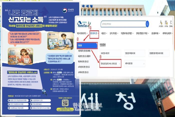 [한국법률일보] 국세청(청장 임광현)은 국민들의 개인정보가 도용돼 허위로 소득이 신고되거나 사업자등록이 신청돼 발생하는 금전적·정신적 피해를 사전에 방지하기 위해 ‘명의도용 안심차단 서비스’를 개통했다고 21일 밝혔다.