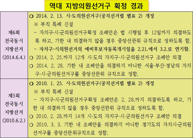 중앙선관위는 “지방선거 때마다 선거구 획정 지연이 반복되는 게 안타깝다.”면서, “빠른 시일 내 관련 규정이 개정될 수 있도록 국회를 비롯한 모두의 관심과 노력이 필요하다.”고 강조했다.