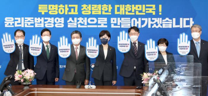 국민권익위원회(위원장 전현희)는 12일 한국전력공사(사장 정승일), 한국지역난방공사(사장 황창화), 한국토지주택공사(사장 김현준), 한국도로공사(사장 김진숙), 한국수자원공사(사장 박재현), 한국가스공사(경영관리부사장 이승)와 정부세종청사에서 ‘윤리준법경영 확산 및 인증제 도입’을 위한 업무협약을 체결하고, 실천 서약 손도장 퍼포먼스를 했다.