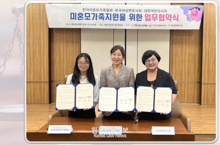[한국법률일보] 한국여성변호사회(회장 김학자)와 (사)대한여한의사회(회장 박소연), (사)한국미혼모가족협회(회장 김민정)가 16일 미혼모가정을 위한 법률·의료지원 업무협약을 체결하고 한부모가정에 대한 지속적이며 실질적인 지원에 나서겠다는 계획을 밝혔다.