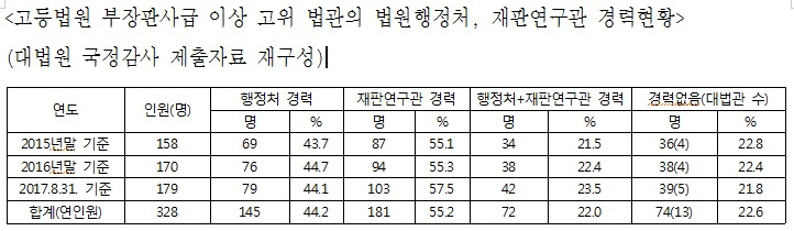 또 2016년말 기준으로 고법 부장판사급 이상 고위법관 170명 중 법원행정처 경력이 있는 법관은 76명, 대법원 재판연구관 경력이 있는 법관은 94명, 법원행정처와 재판연구관 경력이 모두 있는 법관은 38명이었다.